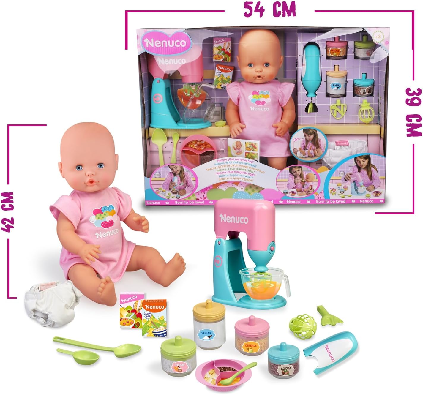 Product Overview:The Nenuco What Shall We Eat Today? set is a fun and educational toy where children can role-play as chefs or parents, preparing food for their Nenuco doll. The set includes various food items and accessories to encourage creative play.Features: