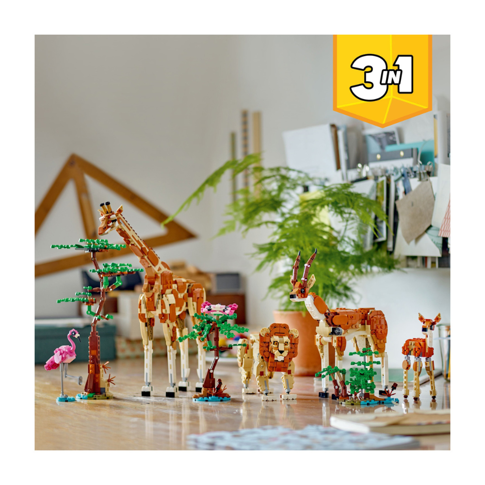 This LEGO set is perfect for imaginative play. It offers kids a world of play possibilities with 3 different animal figures to build using the same bricks. They can build a posable giraffe toy with a tree and a flamingo, rebuild it into 2 posable gazelles, a mother with her calf, plus 2 bushes, or turn it into a lion toy with a tree and a butterfly toy.